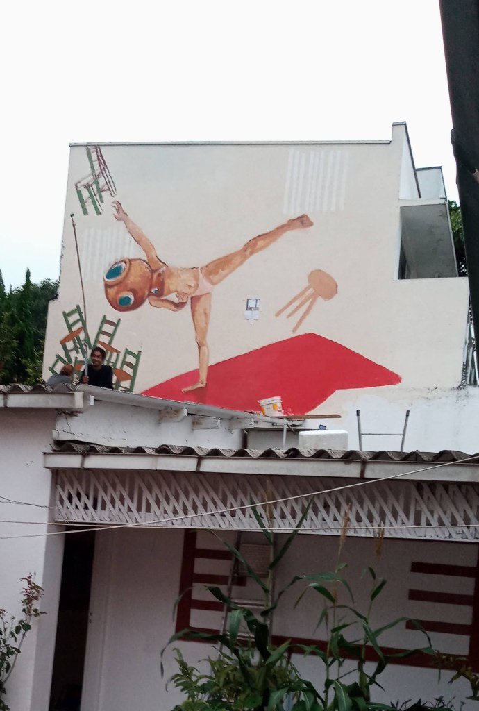 Gosto de explorar pontos de tensão em torno do corpo nu feminino, uma imagem amplamente representada por artistas homens nos museus. Busco deslocar esse olhar, levando o corpo da “musa” para o espaço público, com corpos femininos pintados por outra mulher.
