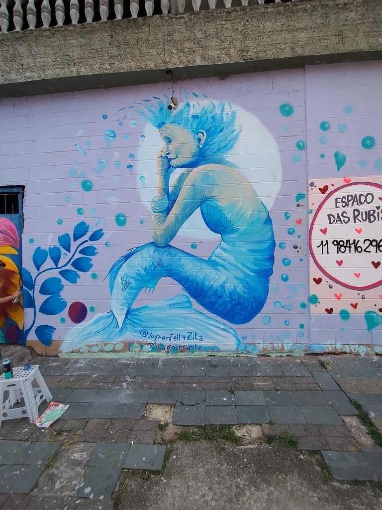 Costumo realizar meus grafites com pincel e spray, e minha paleta de cores é composta por tons de azul, com toques de magenta, rosa e verde.