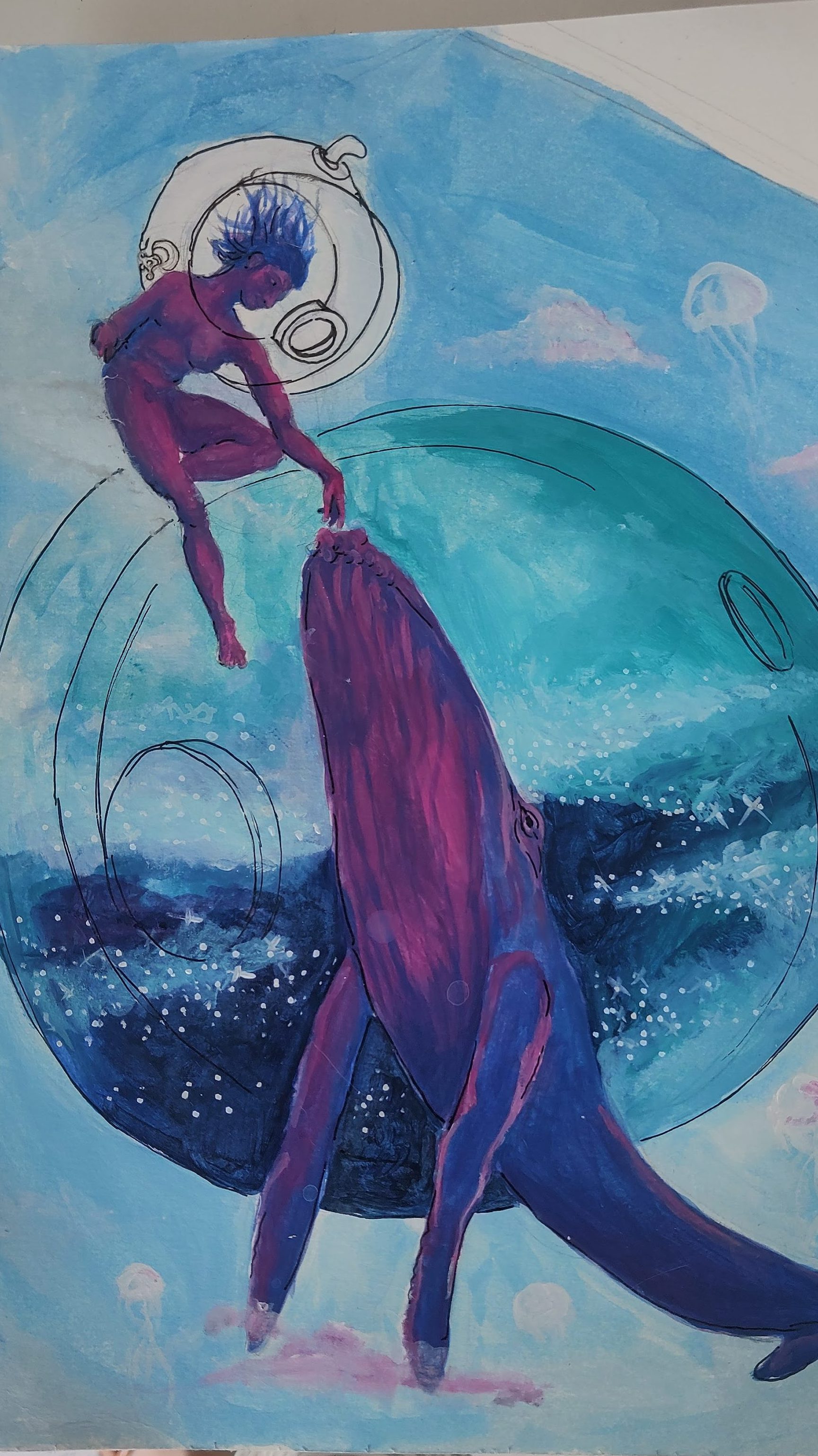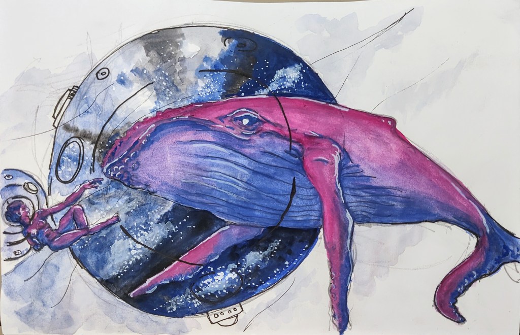 Animal que habita um ambiente inóspito e misterioso, a baleia simboliza, de forma delicada, a beleza feminina, a fluidez, a reprodução e o espírito coletivo. Sua magnitude me fascina tanto quanto me assusta: há beleza e monstruosidade coexistindo em sua forma.