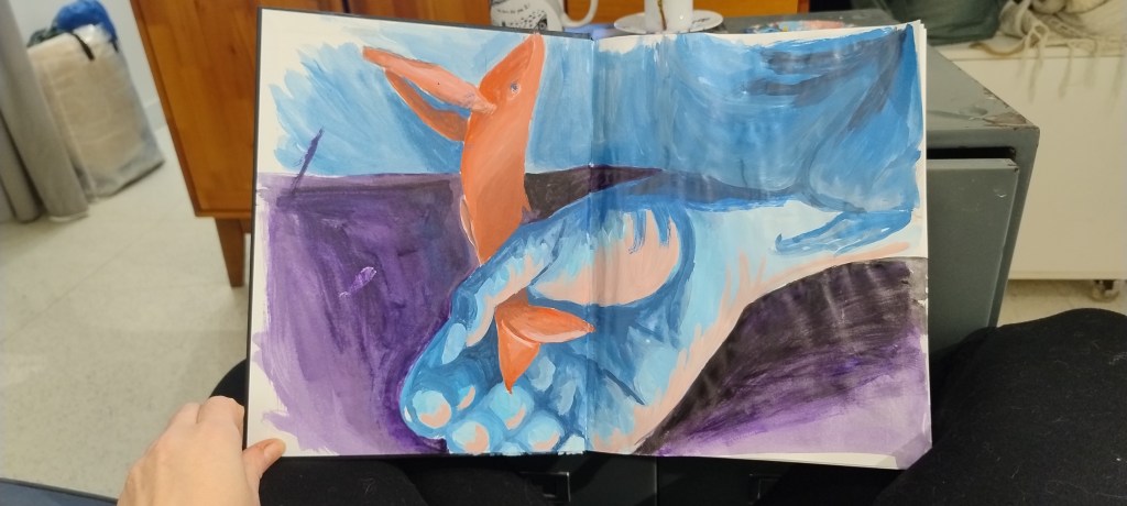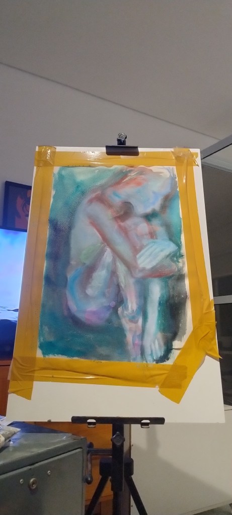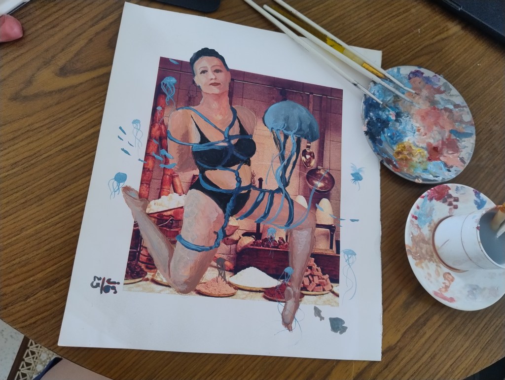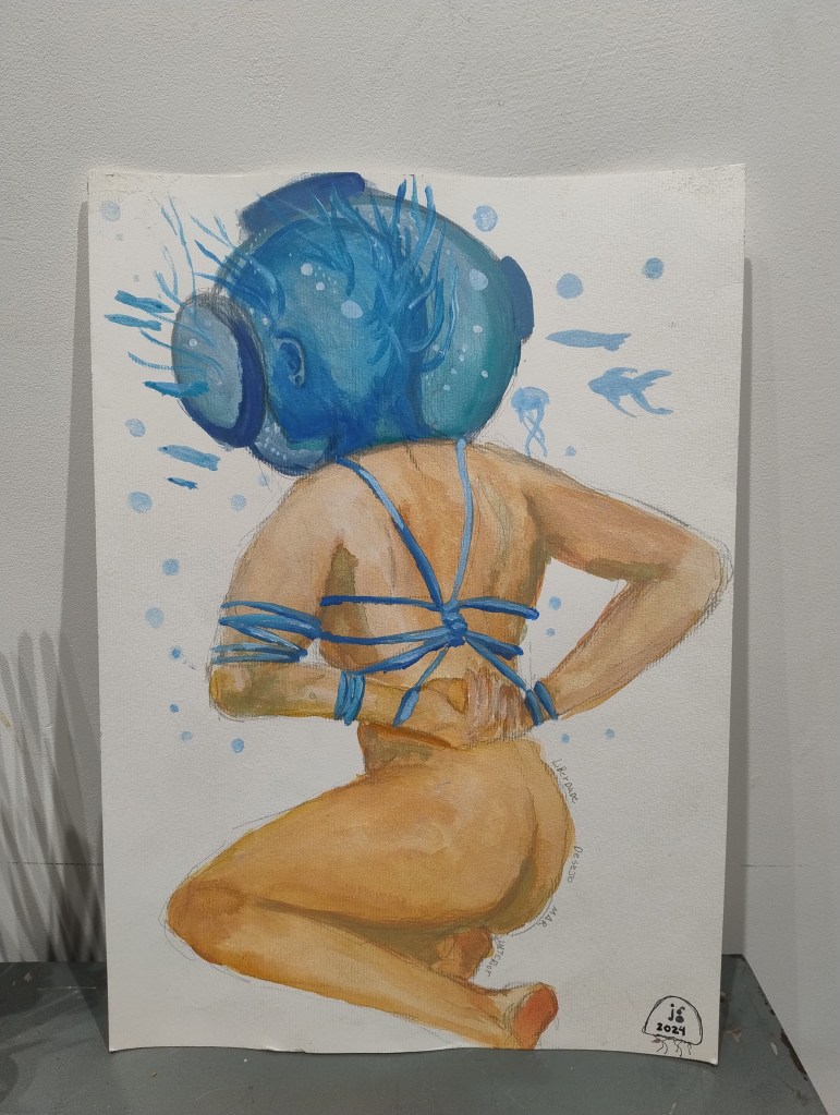 Atualmente, investigo sentimentos e relações que mostram o feminino como um lugar de acolhimento. Outro elemento recorrente em minha obra é a água, representada pela cor azul.